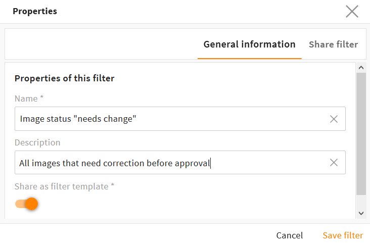 - Geben Sie einen repräsentativen Namen für den Filter ein. Beispielsweise "Bildstatus: Änderung erforderlich".