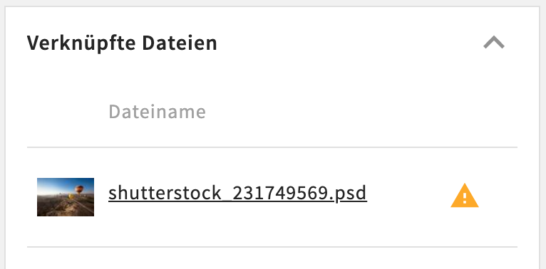 Beispiel: Verknüpfte Datei wurde verschoben oder verändert Verknüpfte Datei gelöscht: Wird eine Datei im System gelöscht, ist die Verknüpfung unterbrochen. Die gelöschte Datei wird mit dem Hinweis-Icon signalisiert. Es wird nur noch die Fallback-Vorschau der Datei mit der Datei-ID gezeigt.